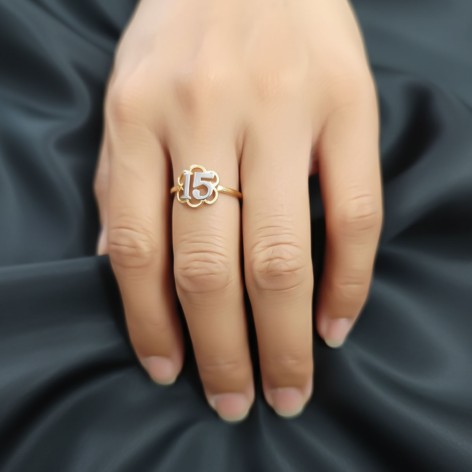 Sortija Oro Amarillo 18 kts. Flor con número 15 rodiado. Cuerpo liso. Motivo de 10x11 mm aprox.