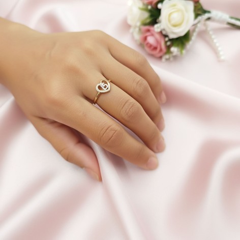Sortija Oro Amarillo 18 kts. Corazón con número 15 rodiado y 9 circonitas talla brillante. Cuerpo liso. Motivo de 10 x 9 mm aprox.