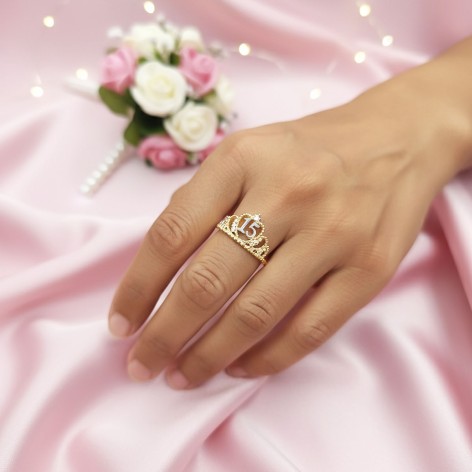 Sortija Oro Amarillo 18 kts. Corona con número 15 rodiado y 7 circonitas talla brillante. Cuerpo galloneado. Mide 11 mm de alto aprox.