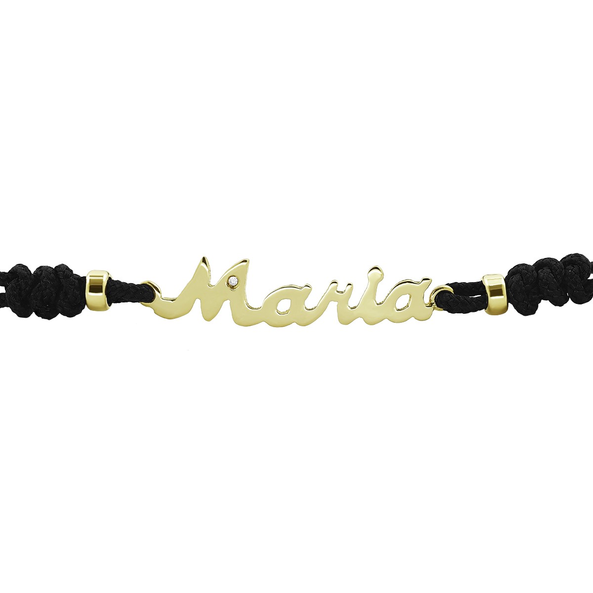 0.002 Cts. Pulsera de hilo negro o rojo con nombre de 3-5 letras. Oro amarillo 18 kts. 1 diamante talla brillante de 0.80 mm. Calidad H-VS/SI. Lleva 2 entrepiezas junto al nombre.